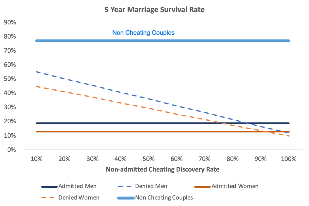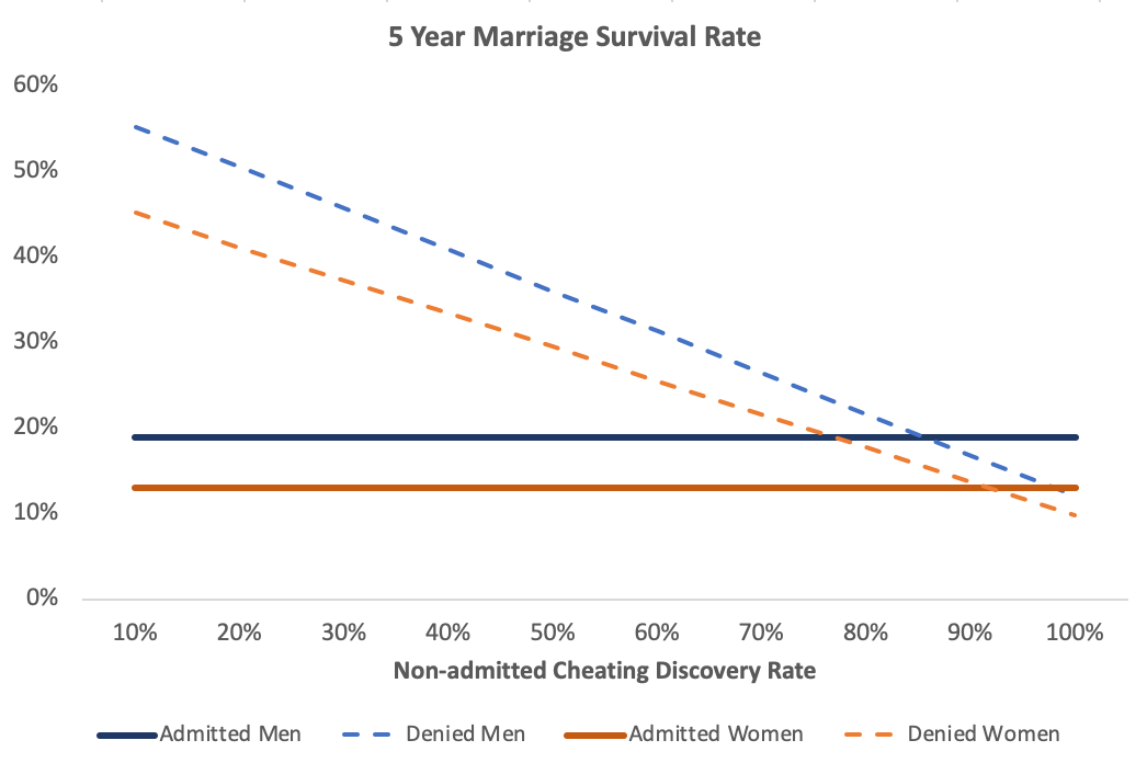 We don’t know the “non-admitted cheating discovery rate,” but if you game it out, and take the proportion of marriages surviving at 5 years, lying cheaters prosper right up until a roughly 90%+ discovery rate.