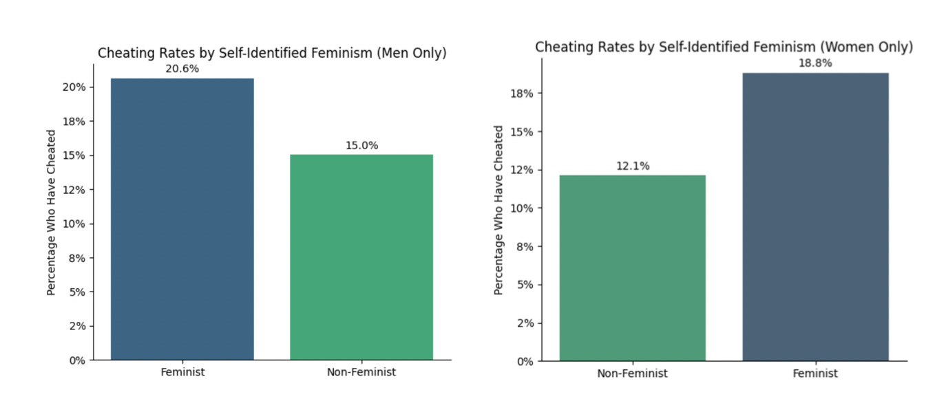 For instance, did you know self-identifying as a feminist makes it more like for both men AND women to cheat?