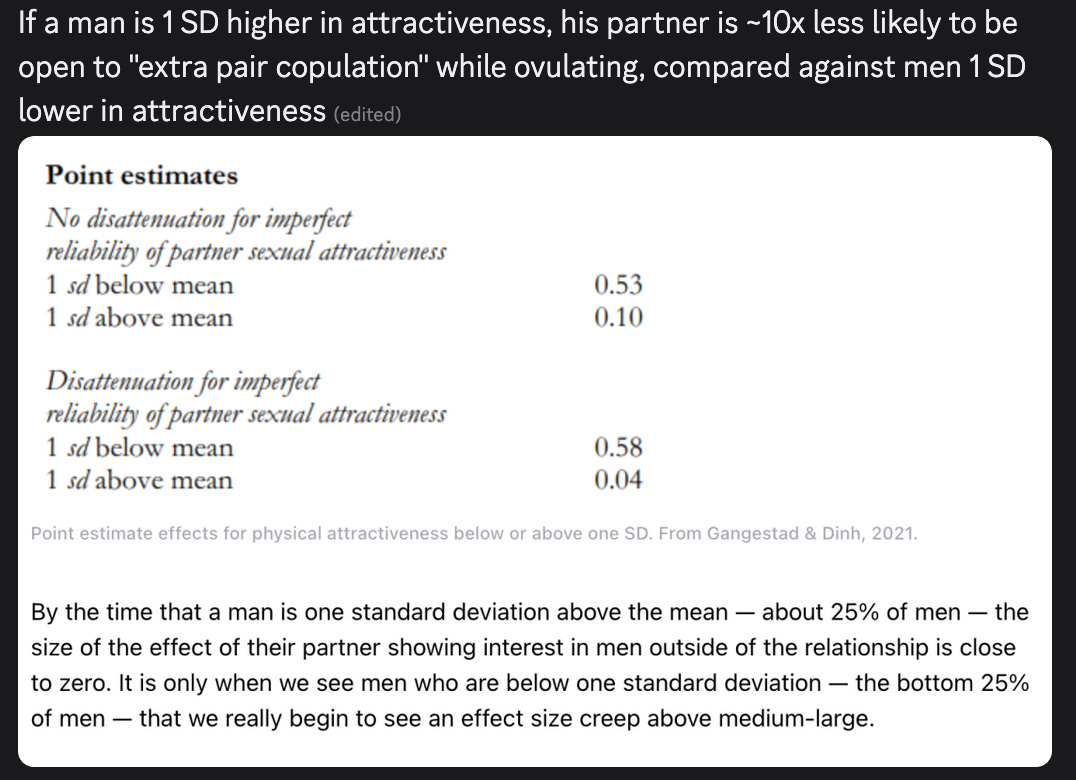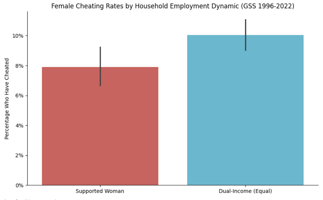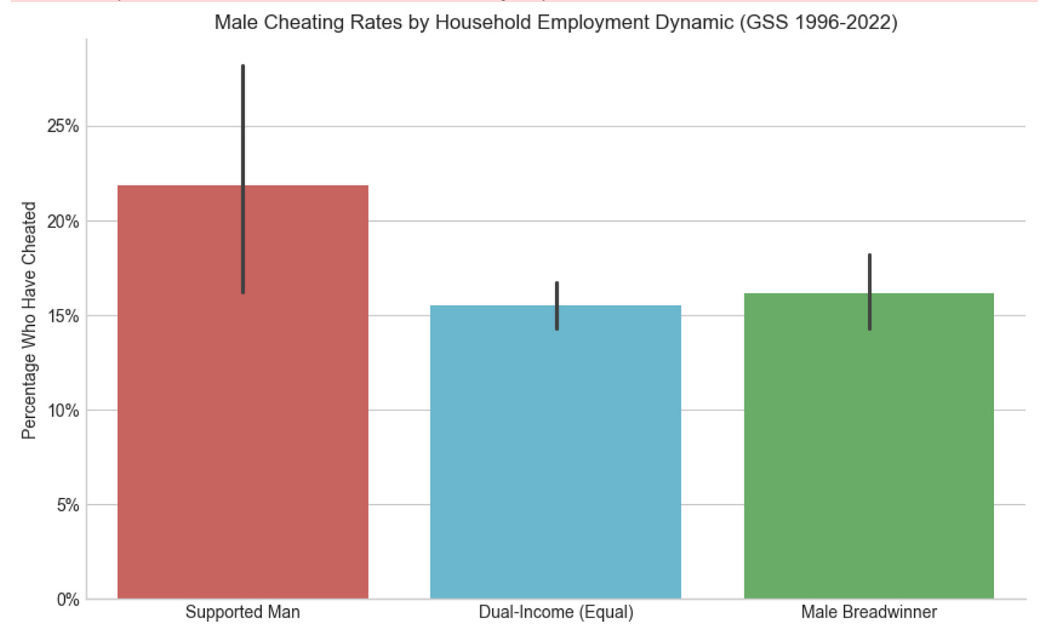 So supported loser husbands cheat more but stay-at-home-dads way less, meaning the optimal strategy for women is to be wealthy to support your partner but also find the time to have kids. This however makes for a bad situation for men, as a wealthy woman who could support you likely went to college and is in a prestigious job around other high-status men.