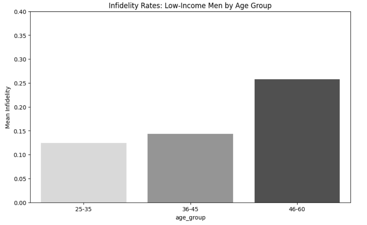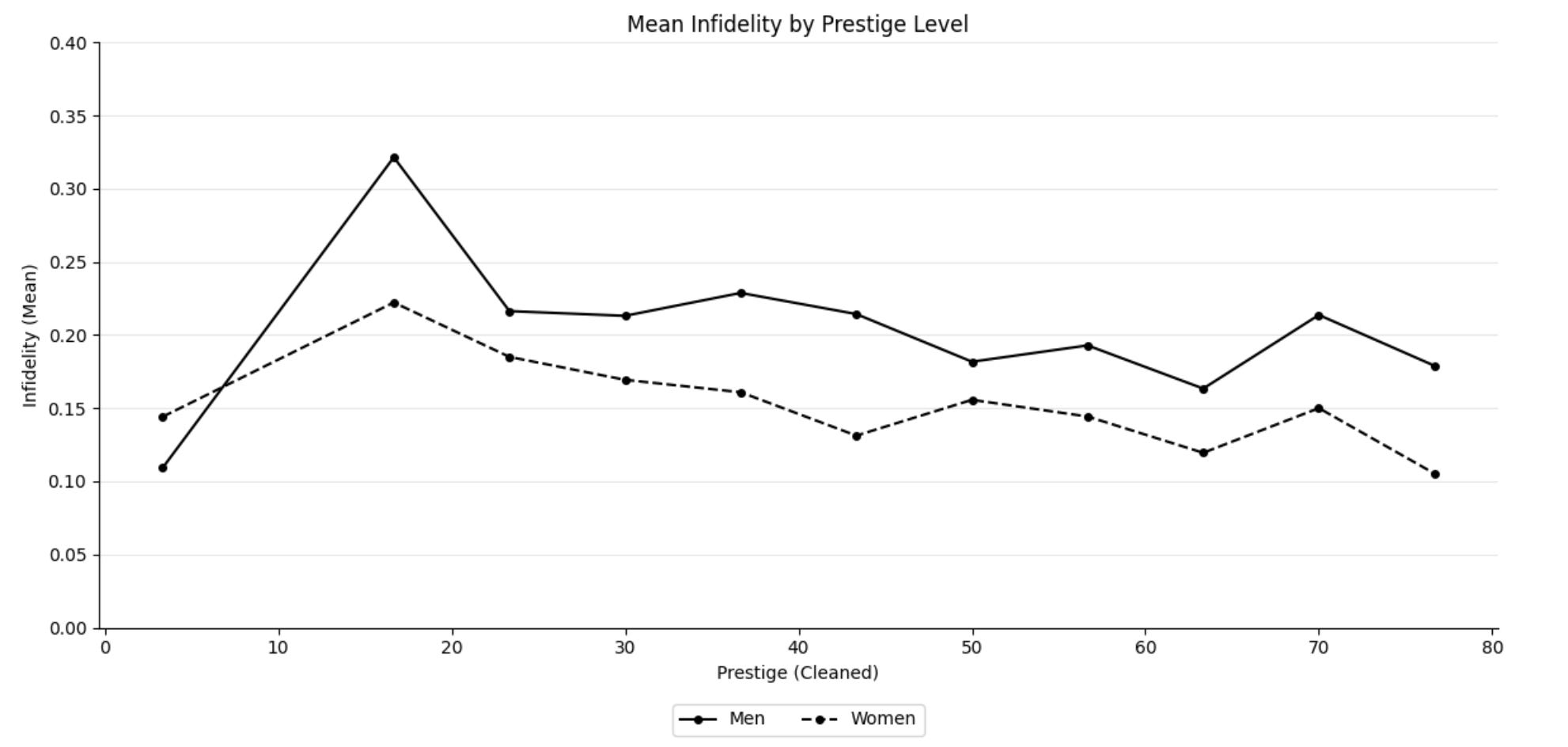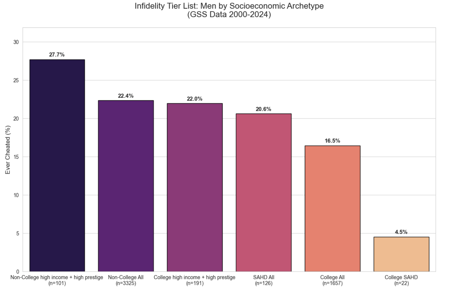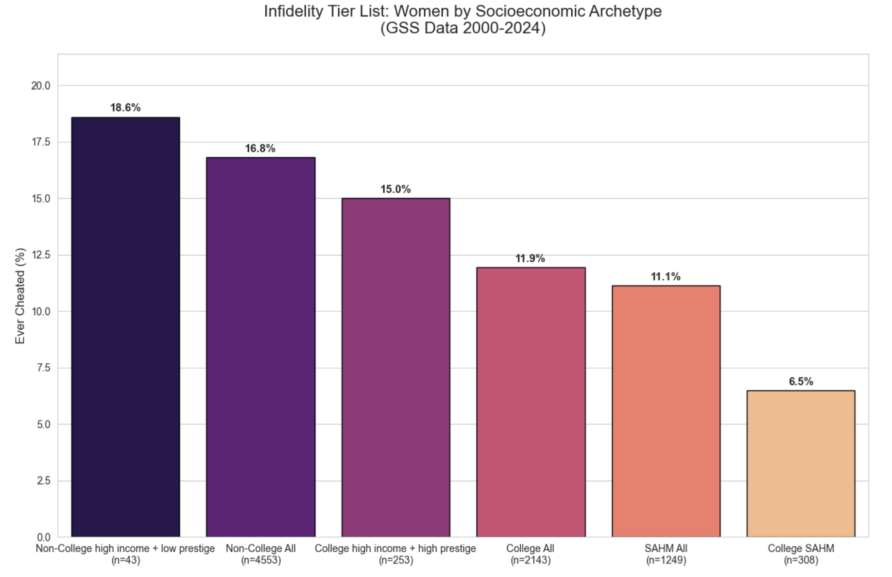 Man, look at that sex frequency! Ain’t NOBODY winning! There’s a handful of professional women with high libidos who are more likely to cheat, likely because they’re not getting enough too, just like the men! These are those top 1-2% of women with actual libidos, and somehow they were unlucky enough to get paired up with a median-or-below libido man or something, because even they are seemingly mismatched and at higher risk of cheating.