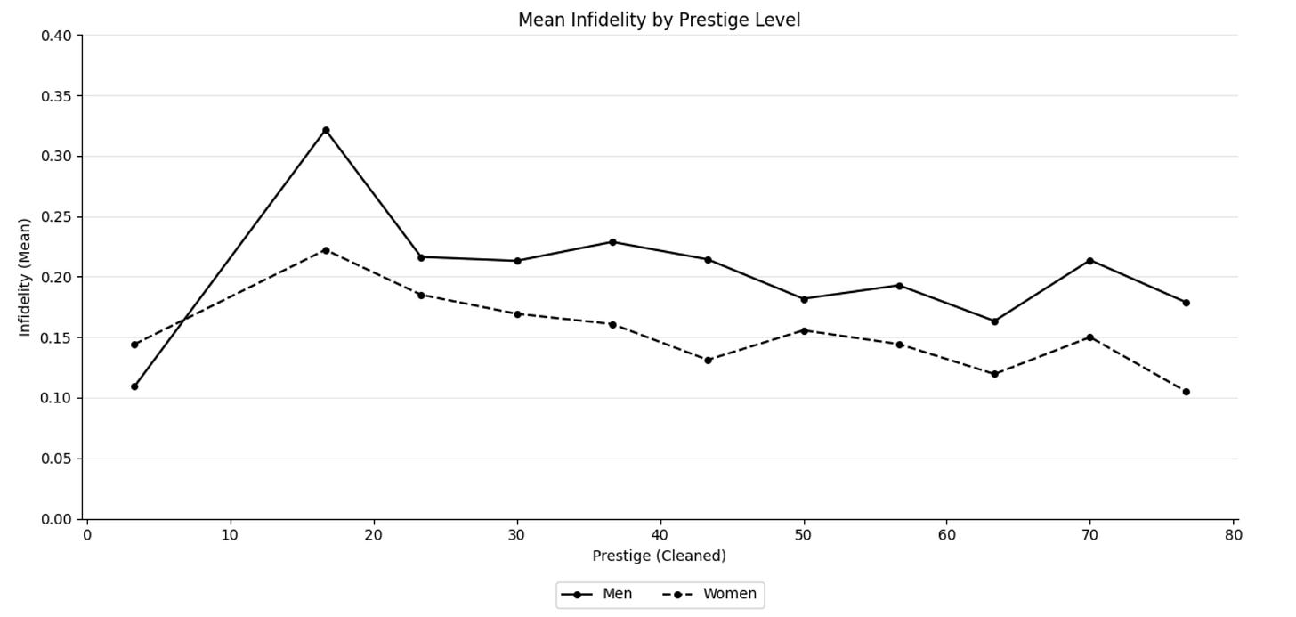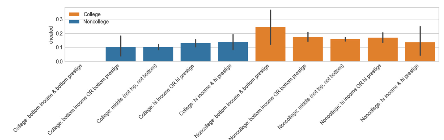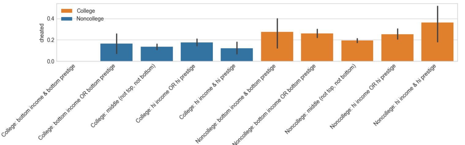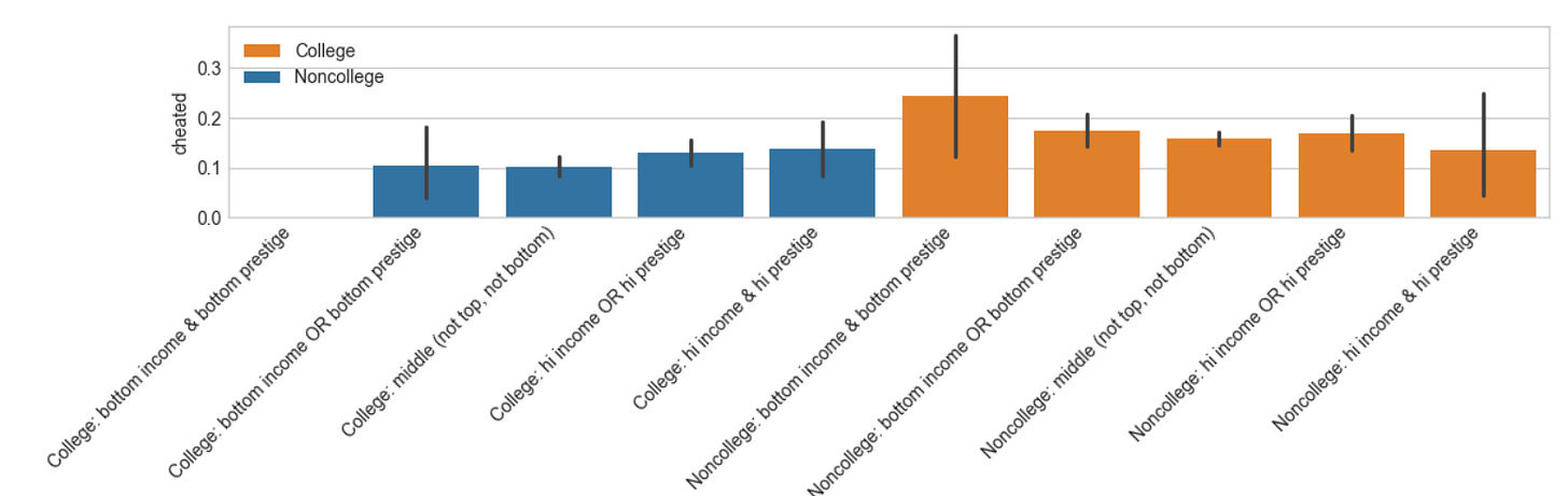 And then cheating mostly declines with prestige, with a little bump at the very end. Why is more occupational prestige protective for cheating? Largely because it correlates with education, and education is a big deal - not just because it loads you down with a house price’s worth of student debt, but for cheating reasons, too.