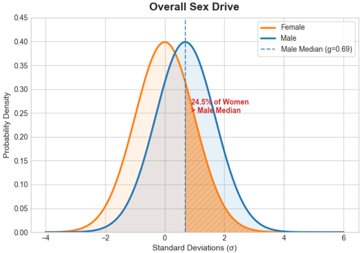 The MEDIAN man has a sex drive that’s at the 75th percentile for women. In other words, for every median man, only 1-in-4 women will match-or-better them in libido. And god help you if you’re at the male 95th percentile - only 1-in-100 women will match you then.