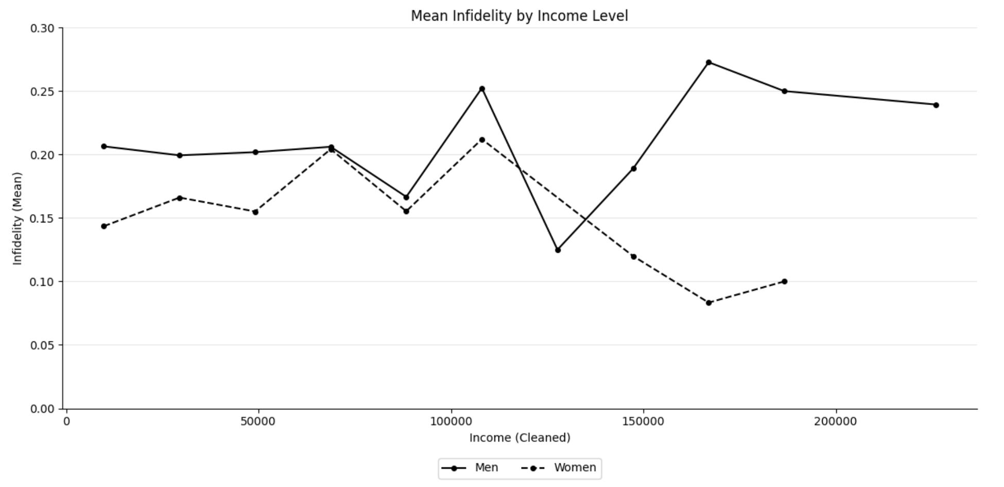 So what’s going on with that wild sawtooth up there? Cheating jumps up for everyone at $100k, then dips for both men and women at $125k. To put it succinctly….HUH?