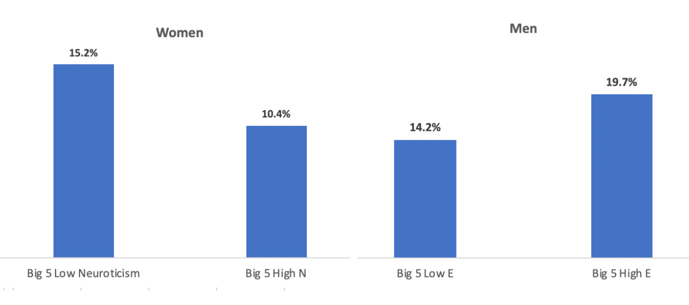 These don’t pass any reasonable p value due to small Big-5-answered sample sizes and are based on modeled risk scores, but we’ve also seen them corroborated in the literature, I just wanted a self-replication.
