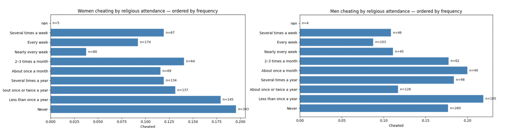 Once again, our godless heathens dominate cheating, but you know, 1 to 2-3 times monthly attenders are doing pretty badly, too, and you’re better off with a “never attender” man, or an “about once or twice a year” person of either gender.