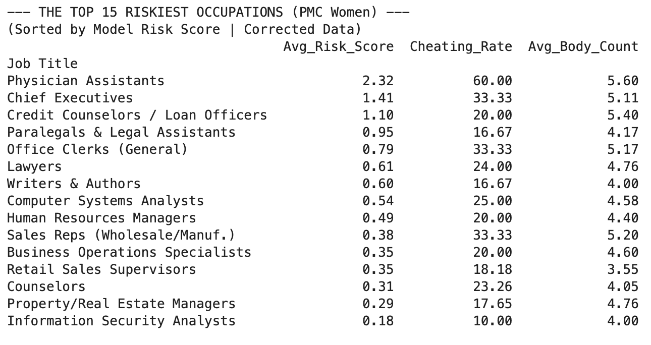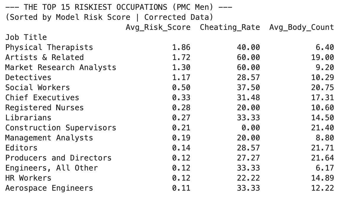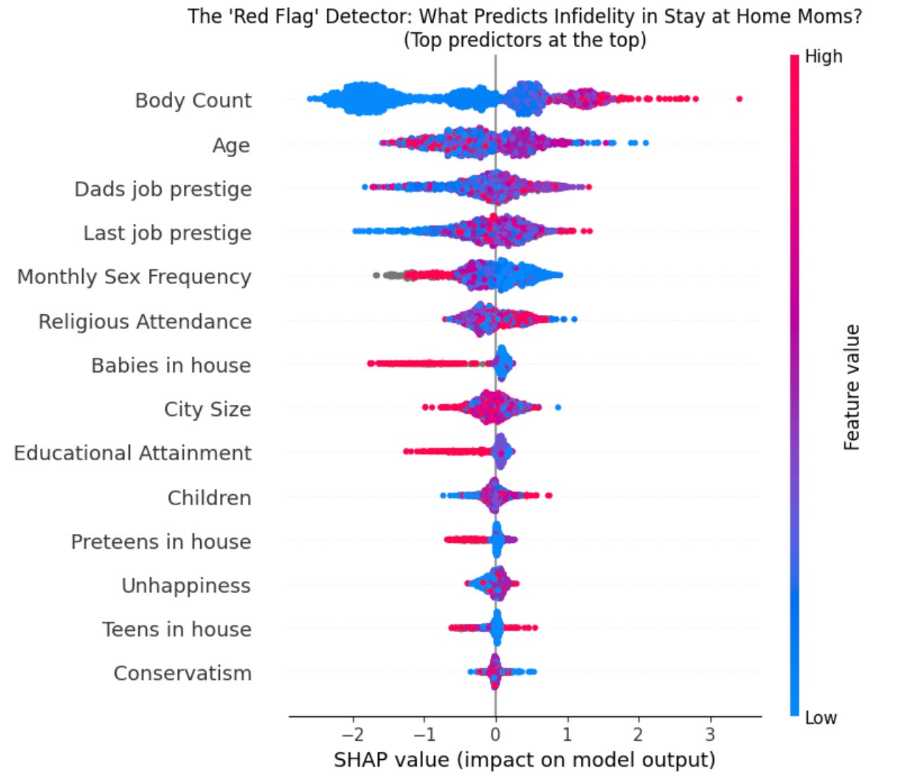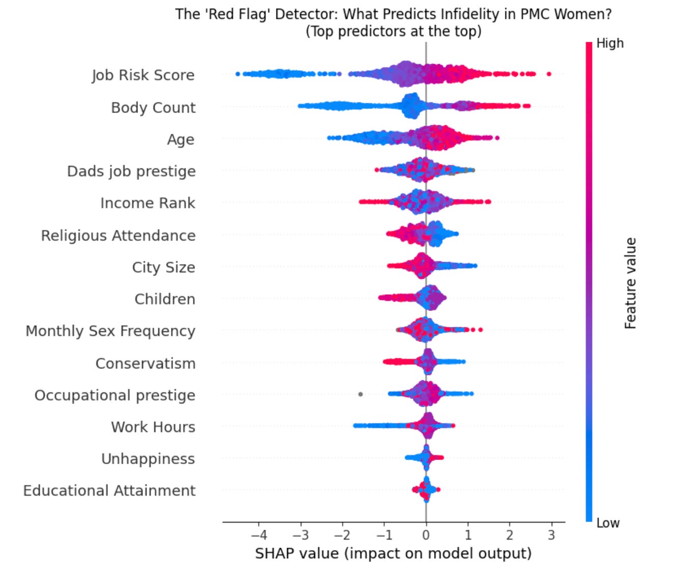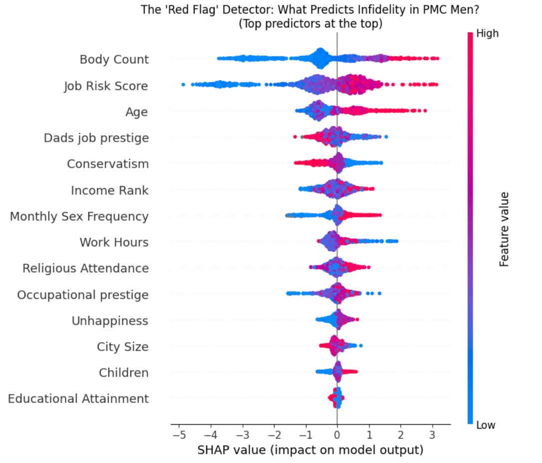 If you have more appetite for reading big pandas tables, I pulled the PMC “sinners and saints” by men and women, literally the attributes of the top 20 individuals most likely and least likely to cheat according to the model I built, for both genders at the links in this sentence.