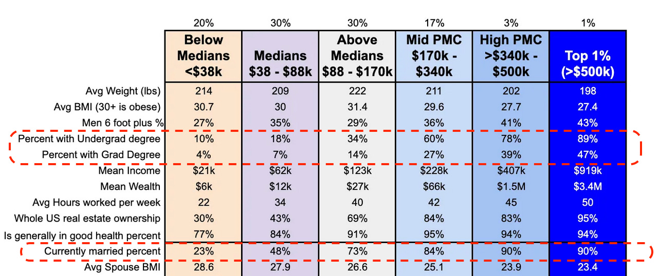 But in men in the top quintile and above of education and income, marriage rates are 85-90%, and college degree rates are 60-90%: