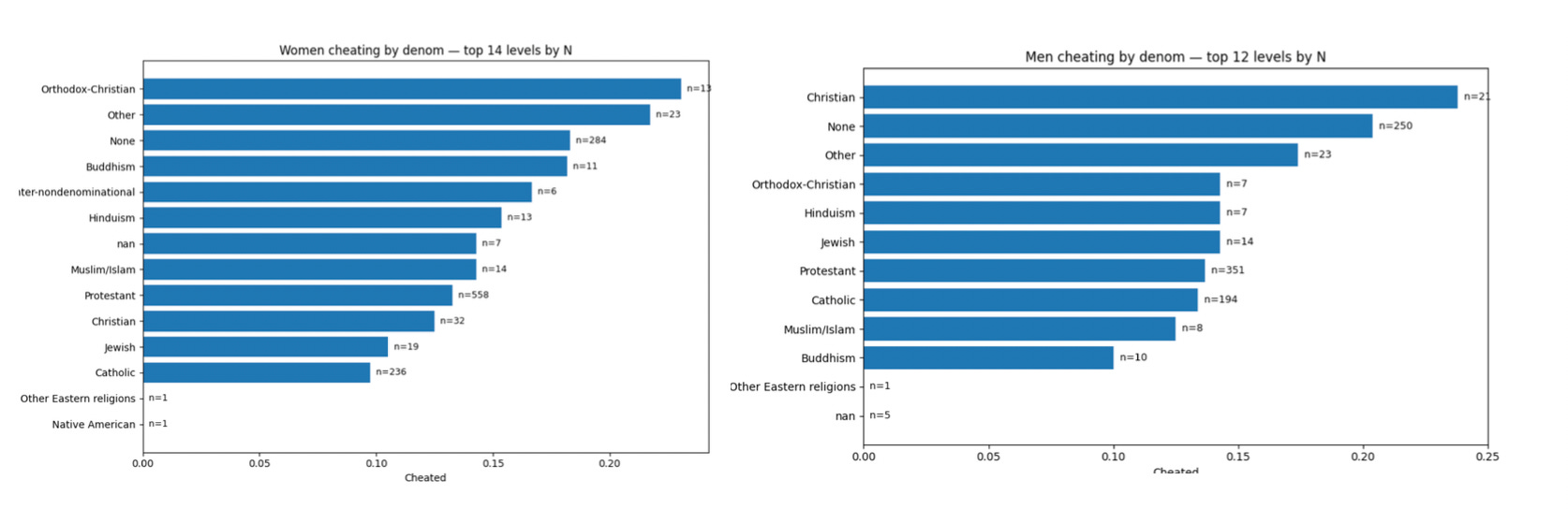 Sure, those godless heathens with no religion seem to cheat more, but the generic Christians and others are pretty close, and honestly, they all clock in pretty close to the base rate.