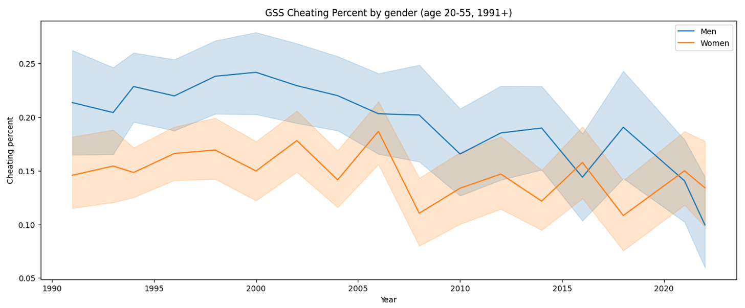 GSS “ever cheated” data is a little lower than Tafoya, and it’s thought that this is due to survey methodology (in person surveys vs online ones show lower numbers for obvious reasons), and generally shows 15-20% for men and 10-15% for women.