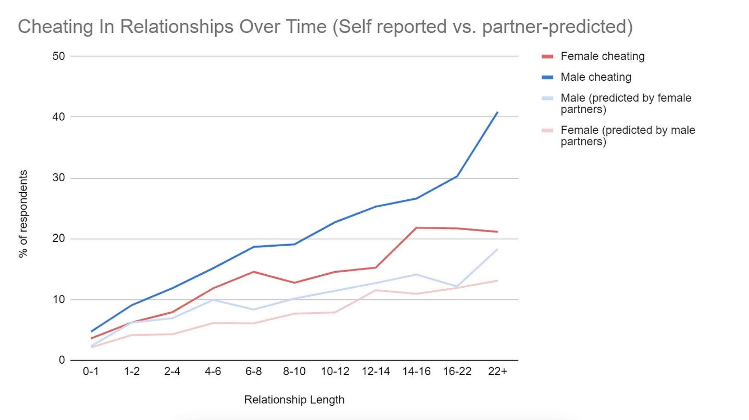The literature is noisy, but in-relationship cheating admission rates are roughly 50/50 “do admit” vs don’t.