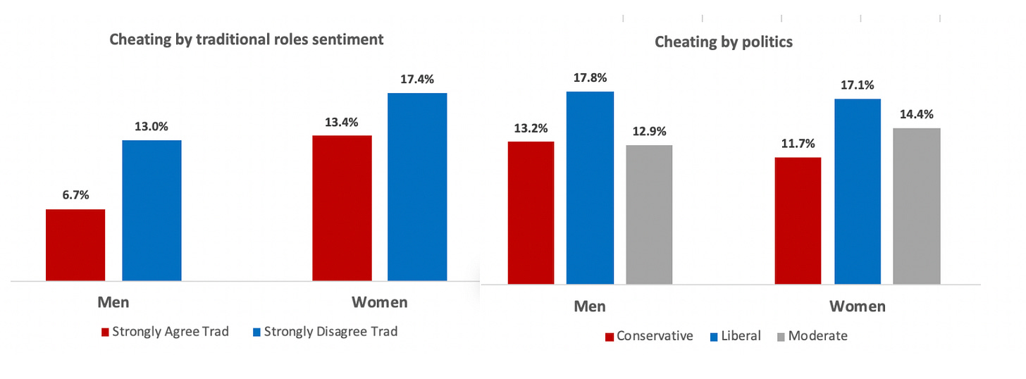 And given this one, the fact that trads and conservatives of both genders are less likely to cheat isn’t going to surprise anyone either, along with people of liberal politics topping the cheating charts: