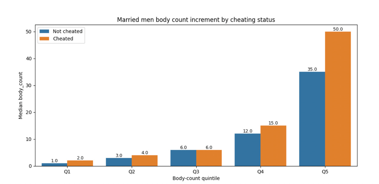 So don’t necessarily get your Spanish Inquisition costume out quite yet (nobody expects the offhand Spanish Inquisition aside!) - because base rates being what they are, the vast majority of high body count people have NOT cheated.