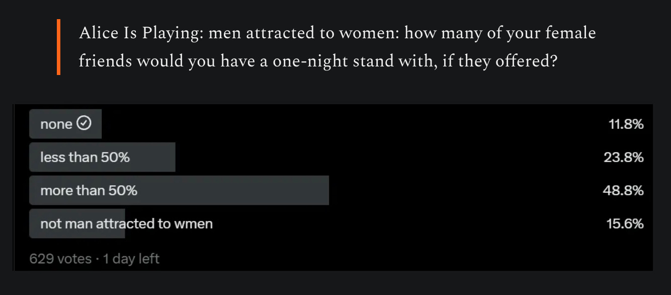 Stunningly, ~90% of men would admit to being willing to happily sleep with at least one of their female friends, and about half would sleep with more than half of them. More at the post, which is a fun read.