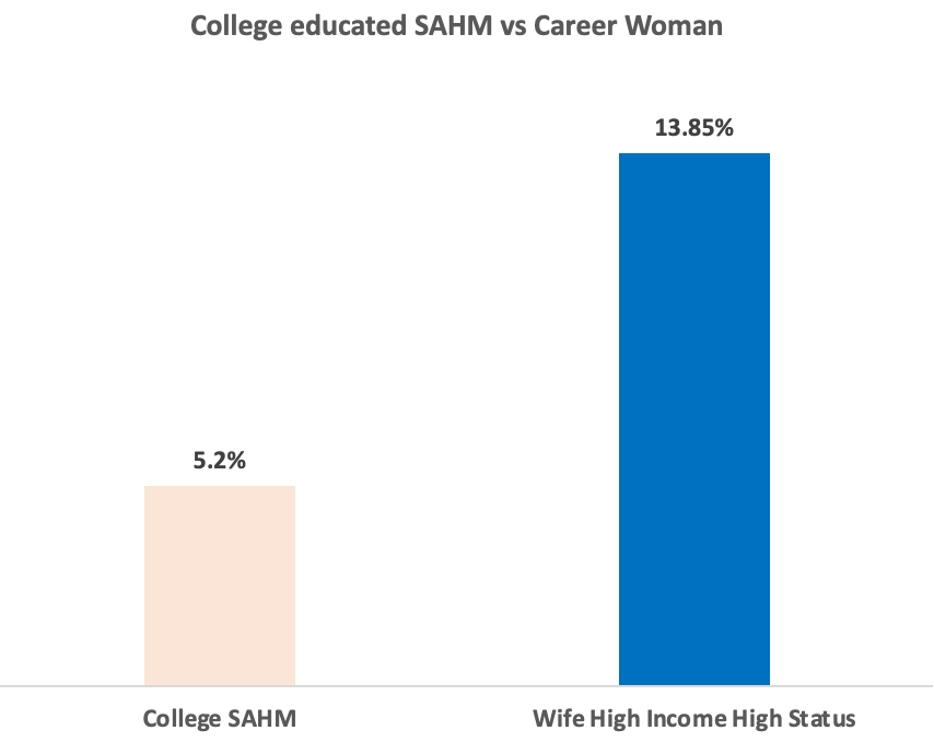 For baccalaureate stay at home moms, you start off safe, and then having kids makes you safer. It’s a huge contrast if you compare a college educated high achiever career wife with a college SAHM!