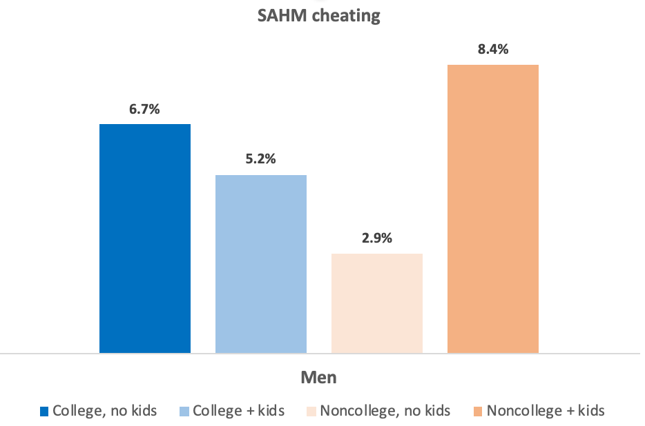 Do we see the reverse? No! It’s noisy, but supported women probably cheat a little less than dual income households. They definitely cheat less when supported when they have a college degree, which we’ll see later.