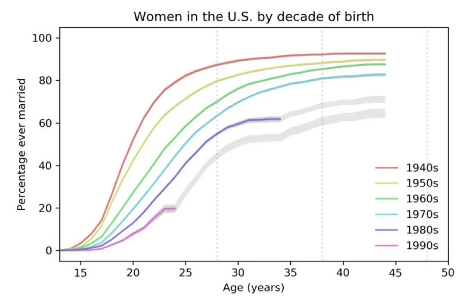 And surprising nobody, those opt-outs are concentrated in the lower male SES tiers. In the bottom quintile of income and education men, only 20% or so get married, and only 48% at the median.