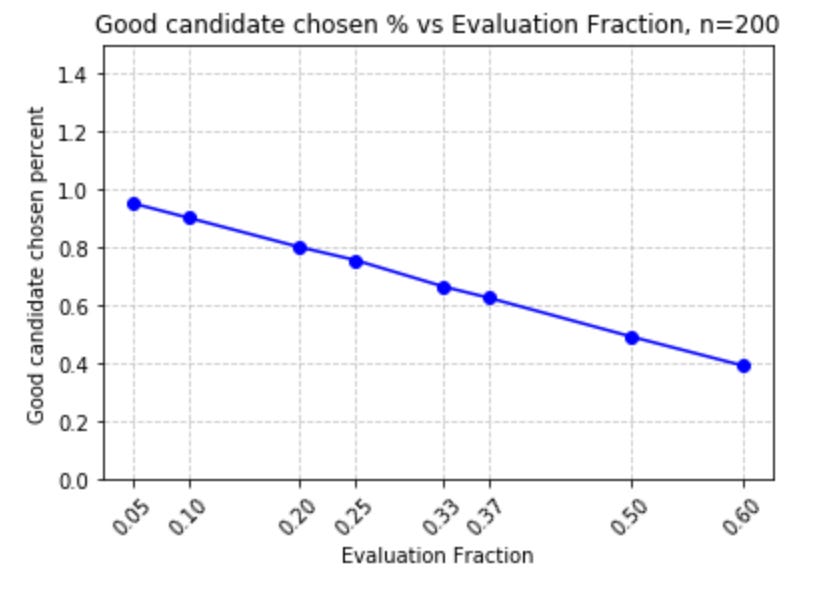 PLUS, if you go too far into your evaluation pool, you end up not being able to find somebody better than the evaluation pool more often, topping out at choosing a non-optimal (ie essentially random) candidate ~61% of the time at a 60% evaluation fraction: