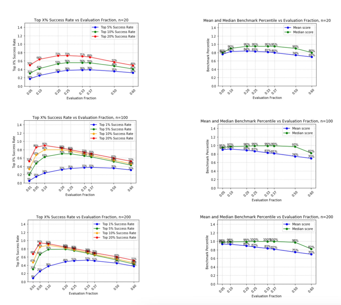 Broadly, the more candidates you have, the better off you are stopping earlier. A top 5% or better candidate is maximized at ~20% evaluated and 100-200 candidates (20-40 total evaluated), and if you were fine with a top 10% candidate, you’re fine stopping at 10% evaluated (10-20 total evaluated).
