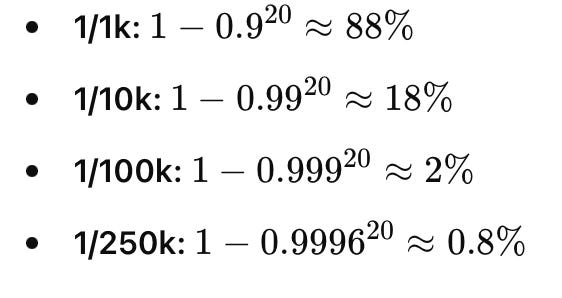 Even if you know your pool is at least 1% or better, if you’re only evaluating 20, and traits are relatively independent, it requires a good bit of luck to do better than a 1/1k to 1/10k candidate. So even if you yourself are a 1/10k or 1/100k candidate, or god help you, even better than that - good luck! Here’s your rough odds: